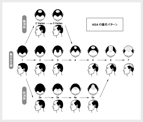 生え際や頭頂部のどちらか「一方」あるいは「両方」から薄毛が進行し、ほとんどの場合、最終的にほぼ同じ形へと変わっていきます。体の栄養状態・年齢に関わりなく抜け毛が進行していくのが特徴的です。