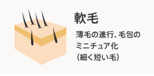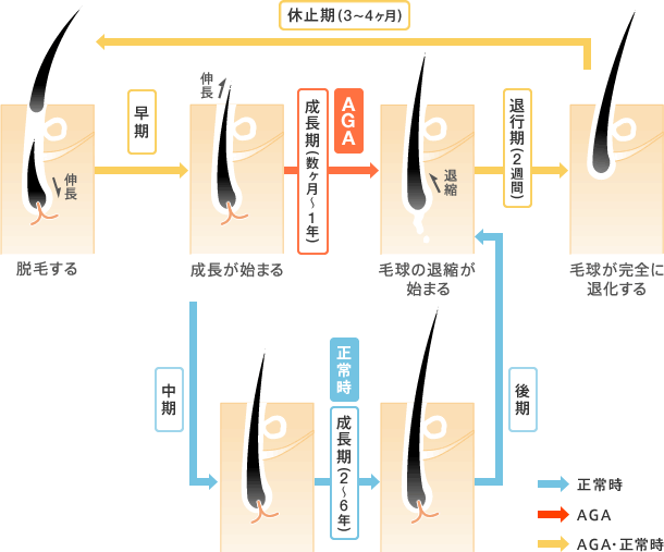 AGAの場合、成長期が短くなることにより髪の毛が太く成長することなく抜け落ちてしまいます。また、成長期の短縮で髪が十分に発育されなくなるため、細く短い髪の毛が増え、薄毛が目立つようになるのです。さらにAGAの場合、休止期も延長されるので、新しい髪の毛が生産されなくなり、薄毛が進行します。ただし、毛乳頭自体は残っていますので、治療することで発毛・育毛の機能を改善することが可能です。