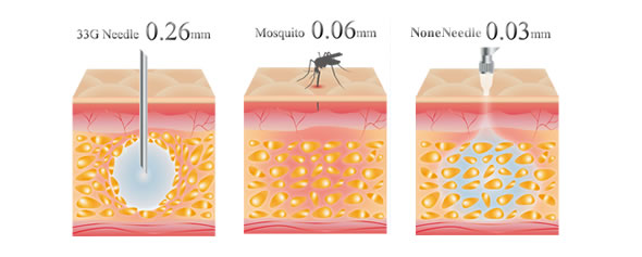 通常のHARG療法で使用している注入針は0.26mm。蚊の針が0.06mmです。蚊に刺されても気づかないことが多いですがノンニードル注射器は更にその半分0.03mmと細いので麻酔を使用せずに痛みをほとんど感じず治療することが可能です。HARGカクテルは0.03(30ミクロン)のジェット流で皮膚表面に噴射されます。
